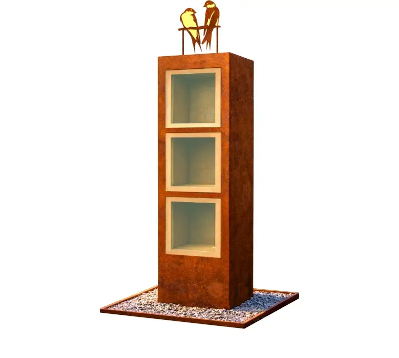 Elke zuil is opgebouwd uit Cortenstaal, een duurzaam materiaal dat de tand des tijds doorstaat en zich steeds verder aanpast aan zijn omgeving. De zuilen bieden plaats aan drie urnen, desgewenst afgedekt met een glazen plaat waarop, op verzoek, naam, data en een figuratie kunnen worden gegraveerd. Dit maakt de zuilen niet alleen functioneel, maar ook een persoonlijk en visueel aantrekkelijk herdenkingsobject.
